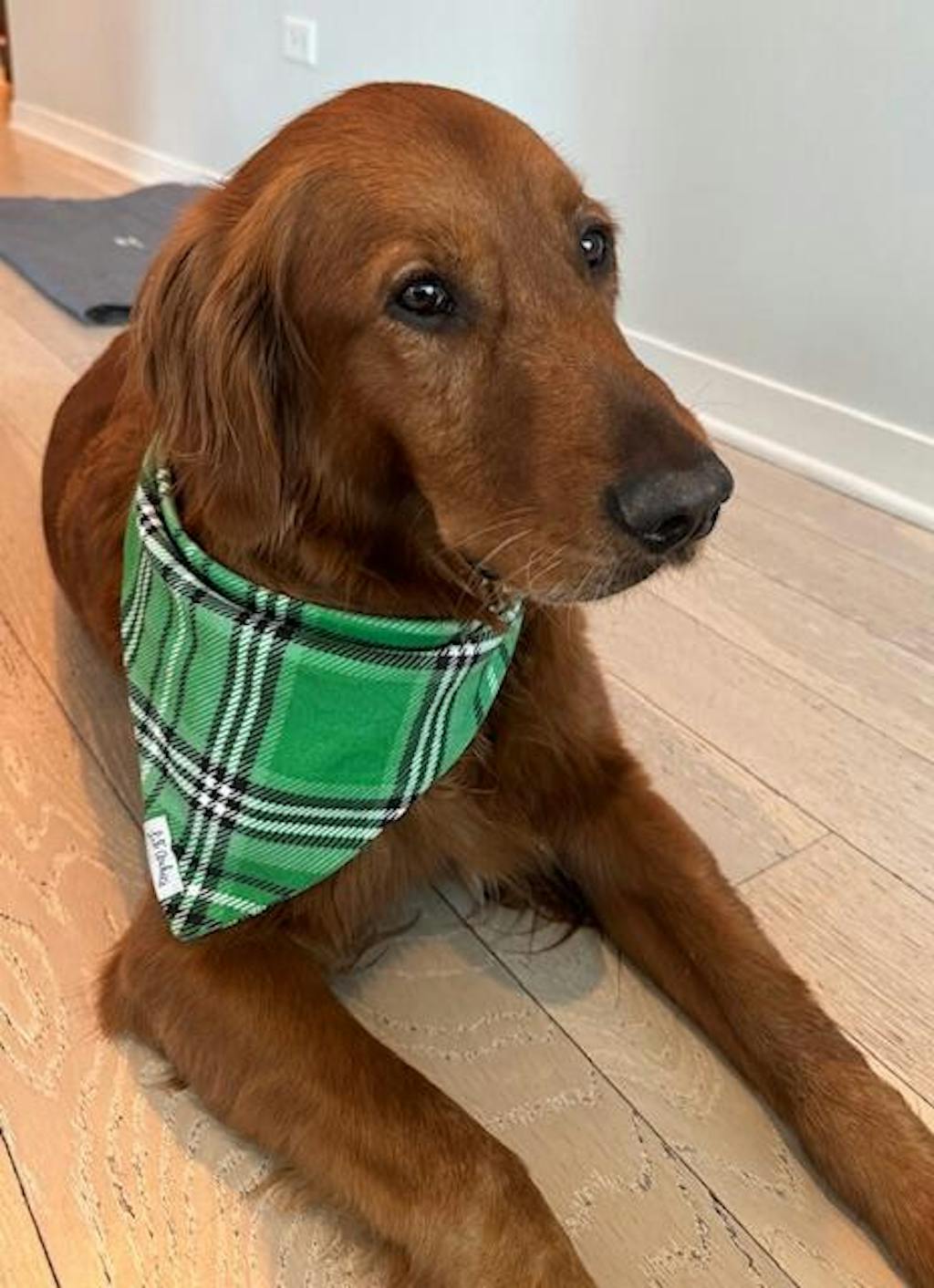 Turn heads on every walk with the Dublin Plaid dog bandana. Inspired by Ireland's lush, rolling green hills, this vibrant accessory is perfect for dogs with a flair for style. Crafted from organic cotton knit, it’s not just a treat for the eyes but is also eco-friendly. Luxuriously comfortable, and effortlessly chic, the Dublin Plaid bandana is a must-have for every fashion-forward pup.
